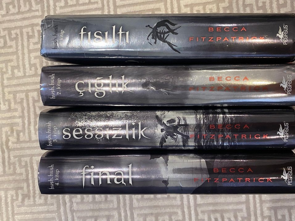 BE Fitzpatrick'ın Fısıltı, Çığlık, Sessizlik ve Final adlı roman seti, her biri kanatlı figürlü koyu kapak tasarımıyla birlikte.