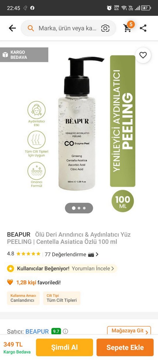 Beapur yüz peeling, Centella Asiatica, ginseng, askorbik asit ve sitrik asit içerir. Tüm cilt tiplerine uygun, ölü deriyi arındırır ve cildi aydınlatır. 100 ml. ✨