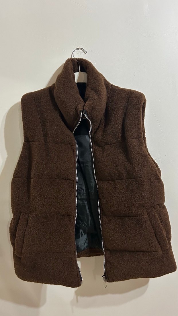 Kahverengi, yüksek yakalı, fitted kesim yelek. Yumuşak, sıcak kumaştan, pofuduk. Sayılı giyildi kusuru yok. Erkek ürünü ama unisex de kullanılabilir. Marka temsilidir.