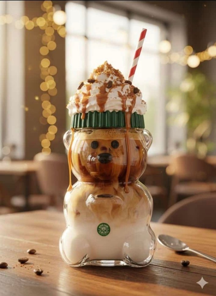 Ayı şeklinde pastel camel renkli bardak, yeşil kapak ve çizgili pipetle. İçinde katmanlı kahve, üstü krem şanti ve karamelle süslenmiş. ☕