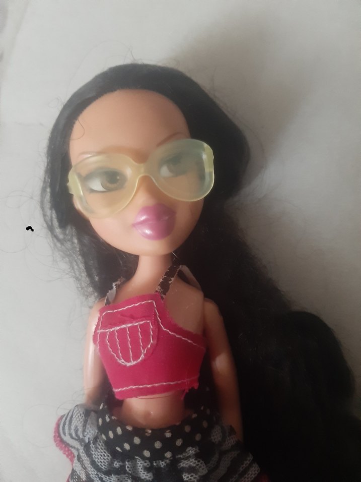 Koyu renk saçlı, pembe üst giyen ve büyük şeffaf gözlük takan oyuncak bebek. Canlı pembe dudakları ve desenli eteği var.