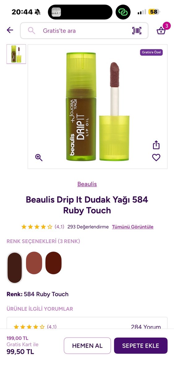 Beaulis Drip It dudak yağı 584 Ruby Touch, koyu haki tonunda, dudakları besleyip renklendiren yumuşak dokulu bir üründür.