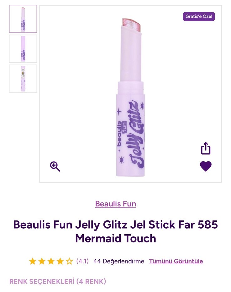 Beaulis Fun'un pastel mor tonlarında, parlak ve ışıltılı jel stick farı. Görünüme eğlenceli bir dokunuş katar.