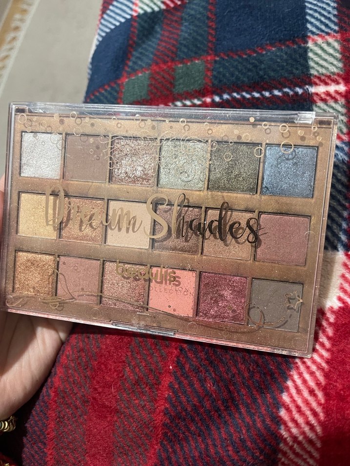 Bu göz farı paleti, mat ve ışıltılı bej tonlarında çeşitli açık ve canlı renkler sunar.