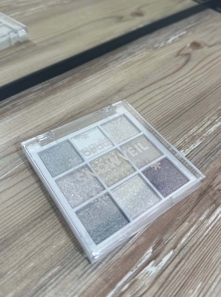 Gri ve bej tonlarında dokuz ışıltılı far içeren palet, zarif göz makyajları için uygundur. ✨