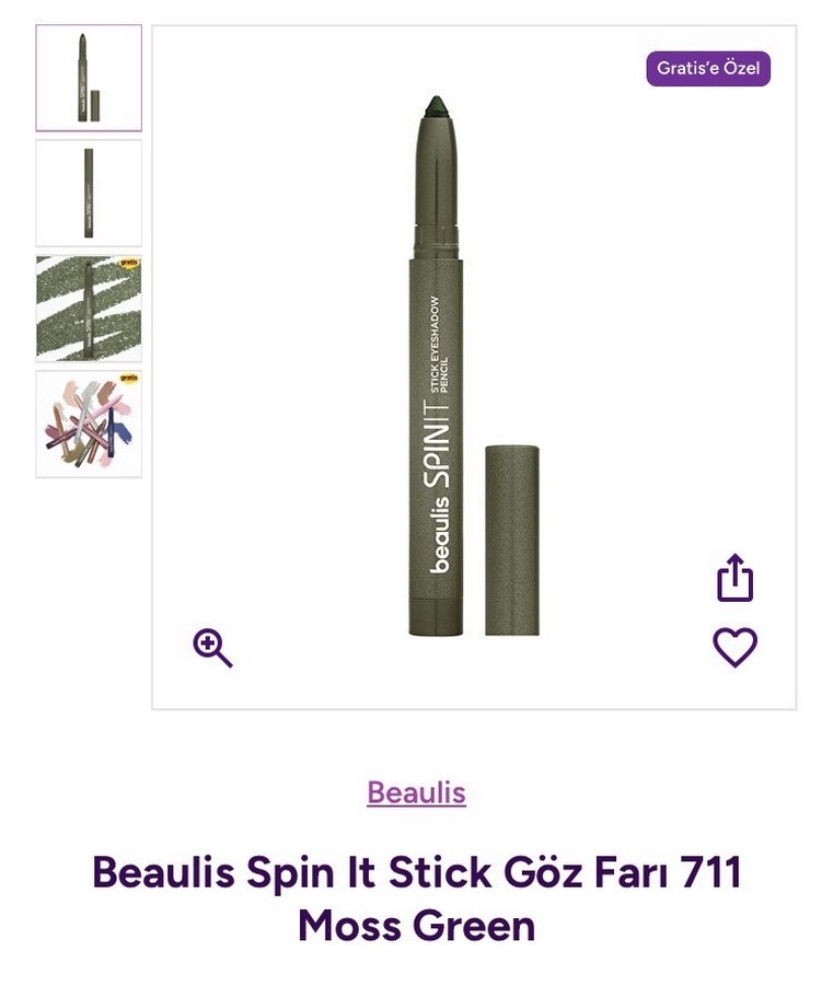 Beaulis Spin It Stick göz farı, koyu yosun yeşili renginde, kolay sürüm sağlayan döner başlıklı kalem formunda. Gratis'e özel üründür.