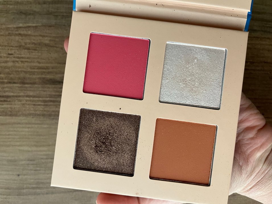 Bu göz farı paleti, krem bej, kırmızı, kahverengi ve turuncu tonlarında canlı koyu renkler içerir. Sadece rengine bakmak için denendi