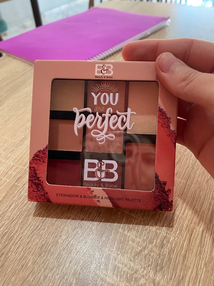 Beauty & Babe açık pembe tonlarda far, allık ve aydınlatıcı içeren palet. Üzerinde "YOU are perfect" yazısı bulunur.