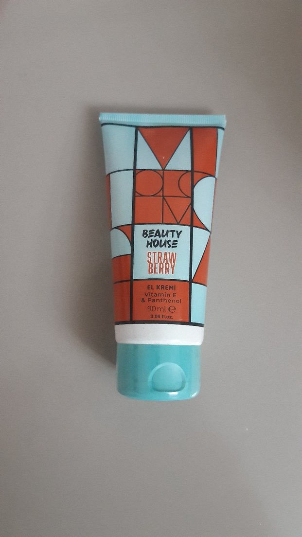 Beauty House çilek kokulu el kremi, Vitamin E ve Panthenol ile zenginleştirilmiş, 90 ml tüpte.