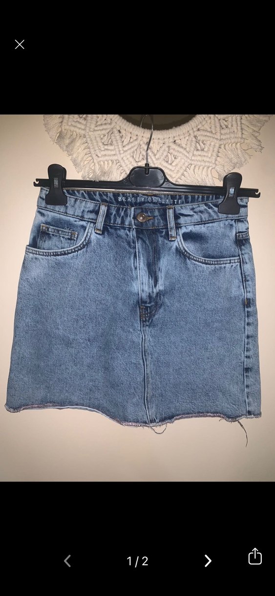 Mavi kot mini etek, bol kesim ve kemer detaylıdır. Sokak modasına uygun, günlük kullanıma elverişlidir. Kısa boy ve sade tasarıma sahiptir.