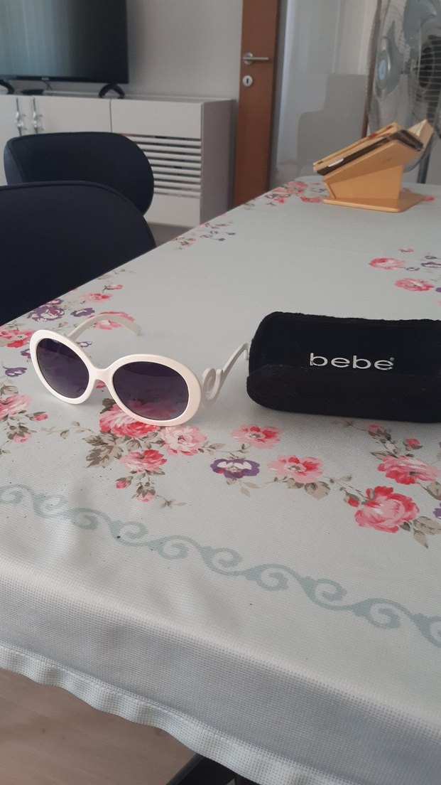 Bebe markalı beyaz boncuk detaylı retro oval çerçeveli kadın güneş gözlüğü, siyah kutusuyla birlikte. Pastel sokak stili için ideal.