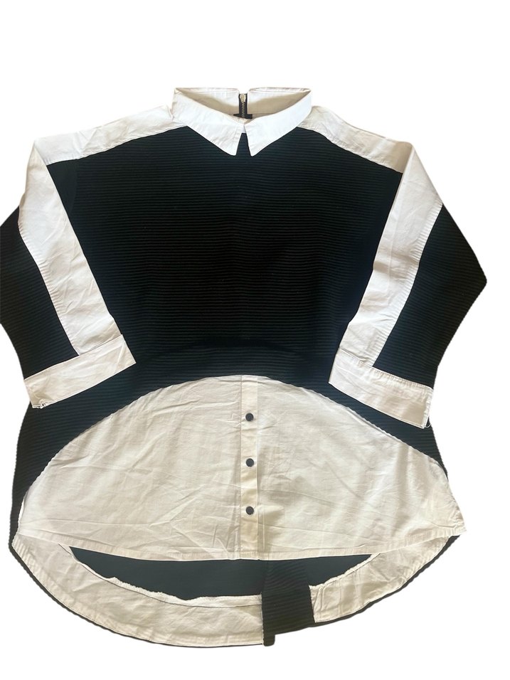 Kadınlar için bol kesim,siyah ve beyaz renklerde yakalı yarım kollu ve düğmeli gömlek detaylara sahip gömlek. Kendinden çizgili ön taraf bir tık daha kısa tarz bluz.Yaka kısmının iç tarafında bir leke mevcut ama görünmüyor belli değil