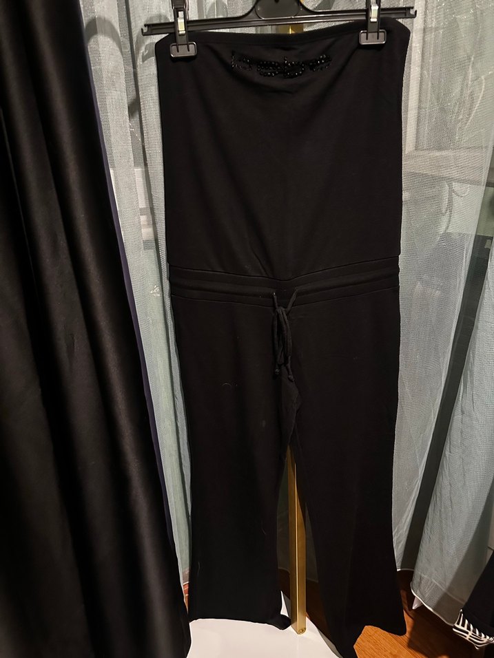 Siyah renkli, straplez, kemerli ve uzun kesim kadın tulumu, satenimsi dokusuyla dış mekan sokak modasına uygundur.