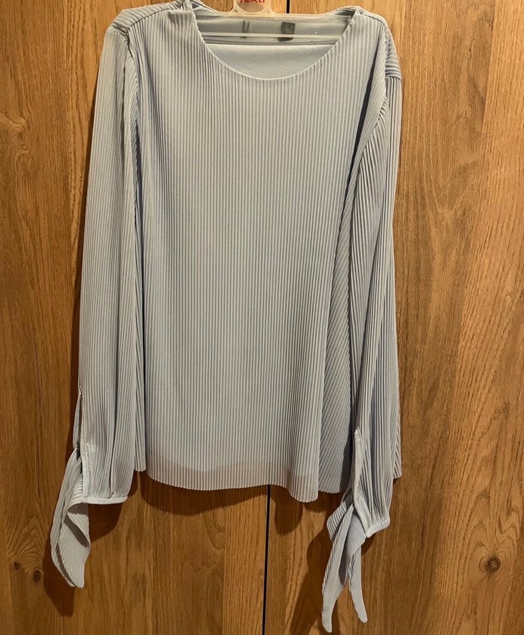 Bebe mavisi renkte, piliseli uzun kollu ve bağcıklı detaylı, yuvarlak yakalı bol kesim bluz. Normal midi boyda, rahat ofis kombinlerine uygun.
