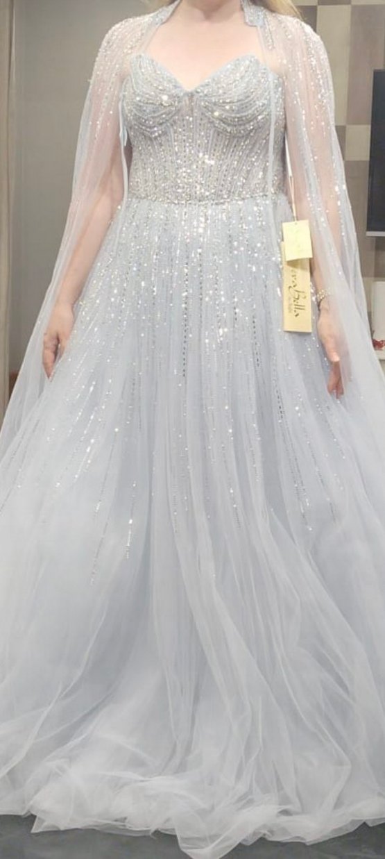 Bu bebe mavisi abiye, ip askilı ve gümüş taşlı pelerinli tasarımıyla fit kesime sahiptir. Uzun boyda, işlemeli ve detaylarıyla çağdaş ve göz alıcıdır. ✨