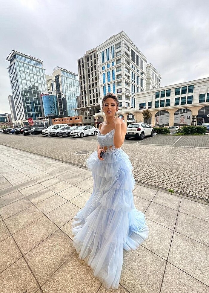 Straplez askılı önü dantel işlemeli abiye bir kere kına da giyilmiştir