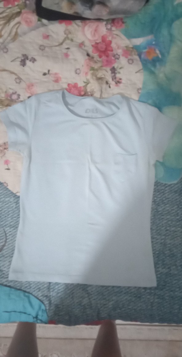 bebe mavisi, kısa kollu, yuvarlak yakalı, pamuklu ve salaş kesim genç crop. Rahat ve sade tasarım, günlük kullanım için uygun.
