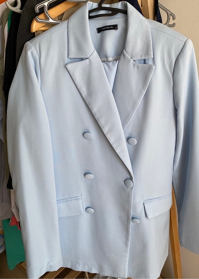Bebe mavisi kruvaze ceketli takım elbise. Ceket 36 Pantolon 38 bedendir (pantolon boy uzunluğu 102 cm) Ürün 2 kere kullanılmıştır