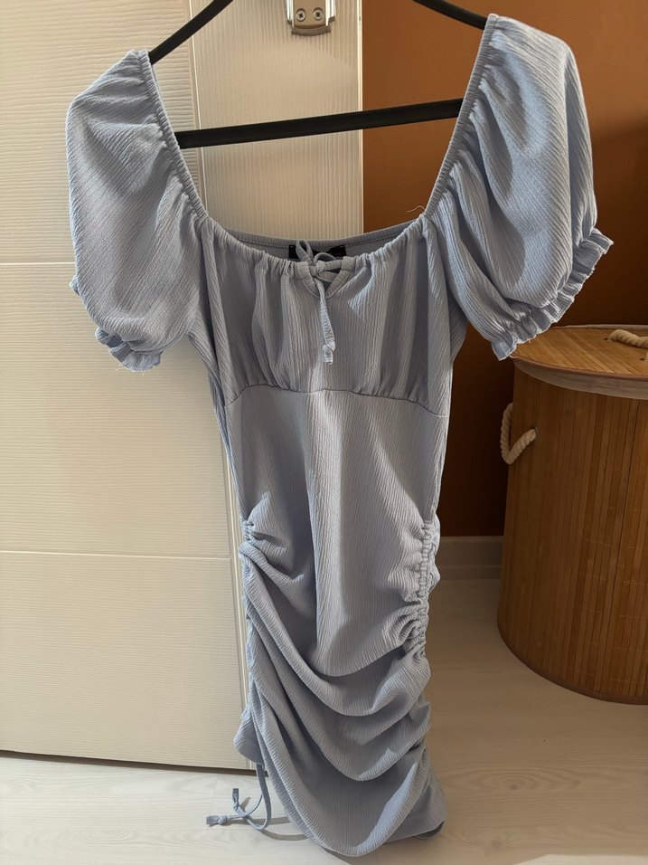 Bebe mavisi midi boy, drapeli ve fitted kesim kadın elbise. Kısa balon kol, kayık yaka ve hafif batik desenlidir. Boyunu istediğiniz gibi ayarlayabilirsiniz yanlarında büzgüleri mevcuttur