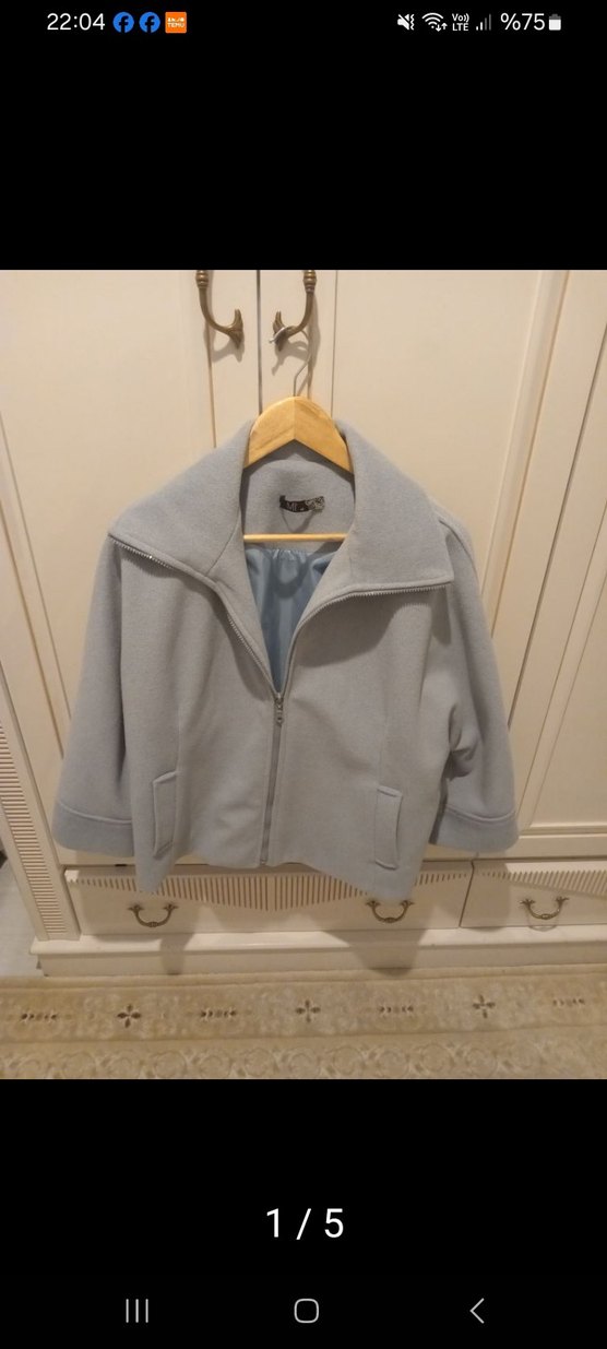 bebe mavisi renkte, yumuşak ve sıcak kumaştan yapılmış hamile ceketi. Fermuarlı ön kısmı, notched yaka ve rahat, bol kesimi vardır. Midi boyda ve günlük kullanıma uygun.