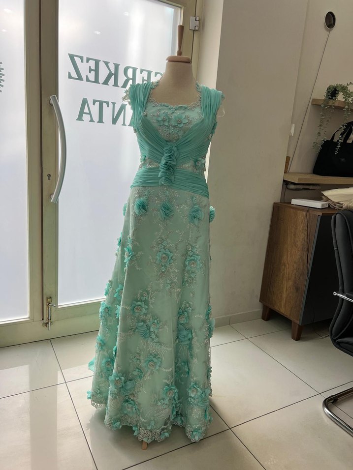 Bebe mavisi renkte, nakışlı ve drapeli uzun abiye elbise. Askısız ve kolsuz, bohem tarzda, yumuşak sentetik kumaştan üretilmiştir. Düğünler için uygun, klasik ve vintage dokunuşlu. Özel Dikim