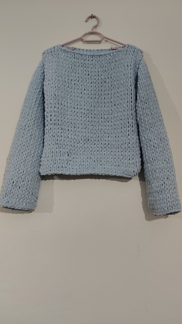 Mavi renkli, uzun kollu ve yuvarlak yakalı kadın örgü kazak. Rahat kesimi ve sade görünümüyle günlük kullanıma uygundur.
