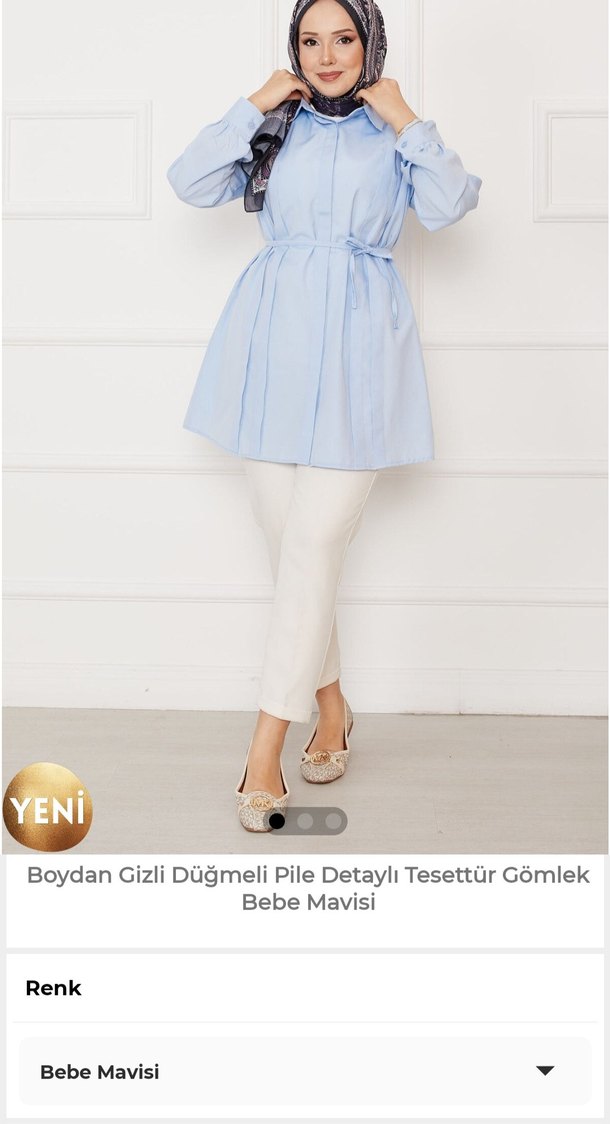 Bebe mavisi pamuk kumaştan, boydan gizli düğmeli ve pile detaylı tesettür gömlek. Tekstil, normal kesim, kayık yaka ve askılı kol yapısıyla ofis için uygundur. Beden yanlışıklı oldu, süreci dolduğu içinde geri almadılar etiketi üstünde