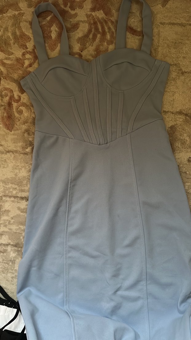 bebe mavisi renkli, straplez ve drapeli detaylara sahip, vücuda oturan uzun abiye elbise. Kolsuz yapısıyla şık ve romantik akşamlar için uygundur.
