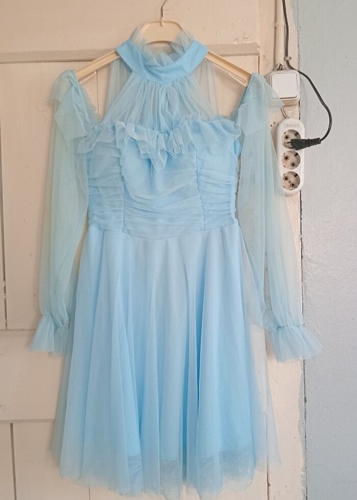 Bebe mavisi tül kısa abiye elbise
