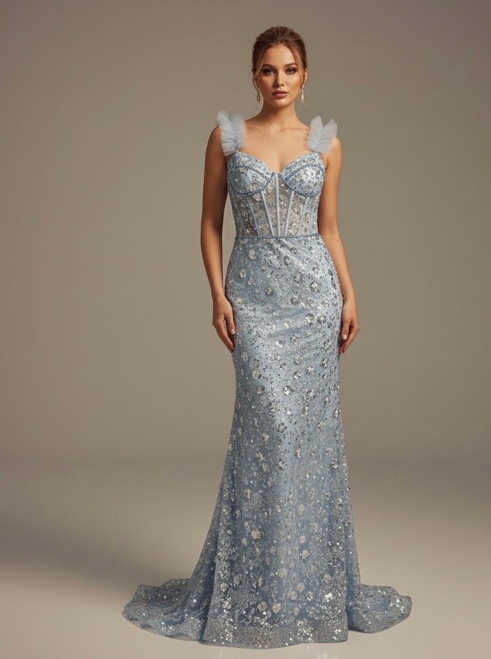 Bebe mavisi uzun abiye, sol arka köşesinde etek ucunda dikiş yapıldı görselde mevcut. Görsel temsilidir