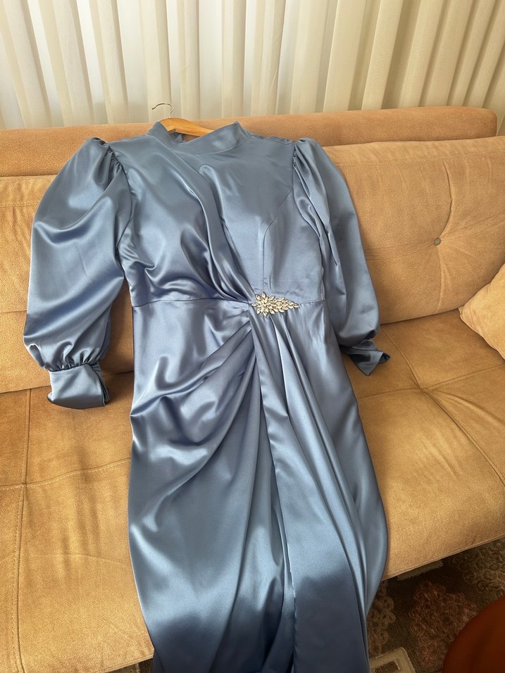 Bebe mavisi Uzun Drapeli Kadın Abiye Elbise