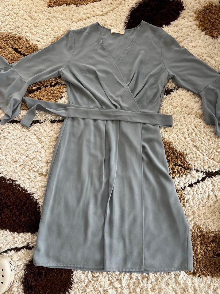Bebe mavisi renkte, uzun kollu ve bol kesim tarzda kadın elbisesi. Belde bağlama kemeri bulunur, rahat ve sade tasarımdadır.