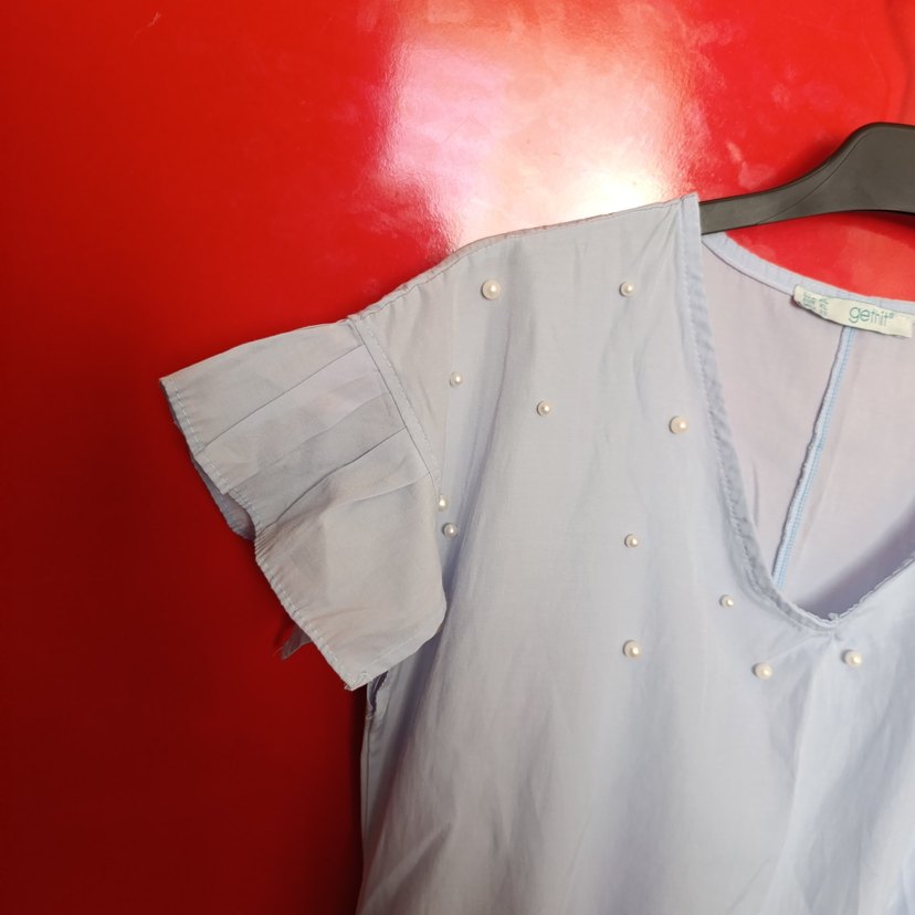 V yakalı, pilili kısa kollu ve inci işlemeli kadın kazak ebisesi Sentetik kumaştan, düğmeli ve bol kesim. Sokak modasına uygun, günlük kullanıma ideal.