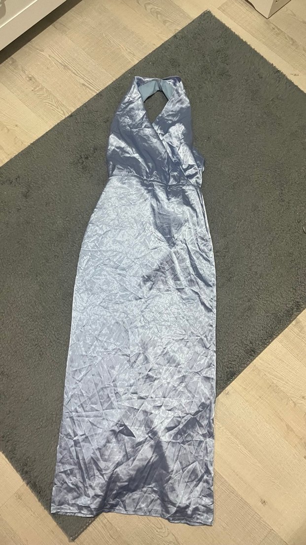 Kolsuz, v yakalı ve drapeli tasarıma sahip, ince dokulu gri uzun elbise. Minimalist ve avant-garde sokak stili sunar, dış mekan kullanımı için uygundur.