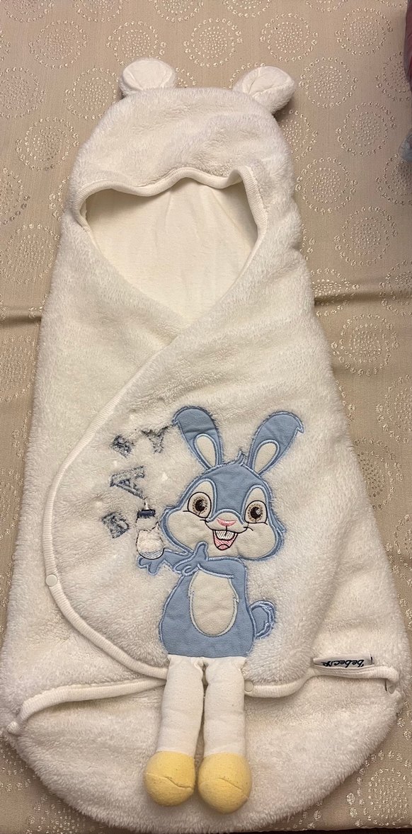 Yumuşak ve sıcak kumaştan yapılmış, mavi tavşan nakışlı beyaz bebek kundağı. Çocukları sıcak ve rahat tutmak için idealdir. Sıfır ayarındadır sayılı kullanılmıştır.