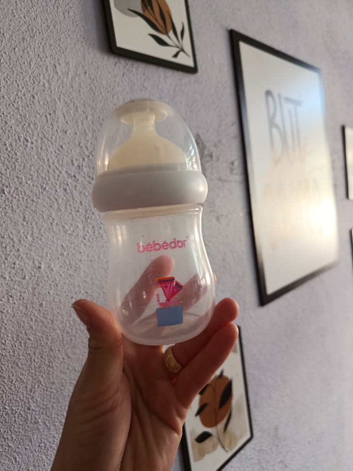 Bebedor beyaz renkli, pastel tasarımlı bebek biberonu, şeffaf kapaklıdır.