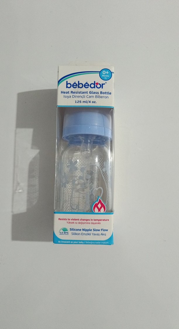 BébéDor 125 ml ısıya dayanıklı cam biberon, silikon emzikli yavaş akışlı yapıya sahiptir. Sıcaklık değişimlerine karşı dayanıklıdır.