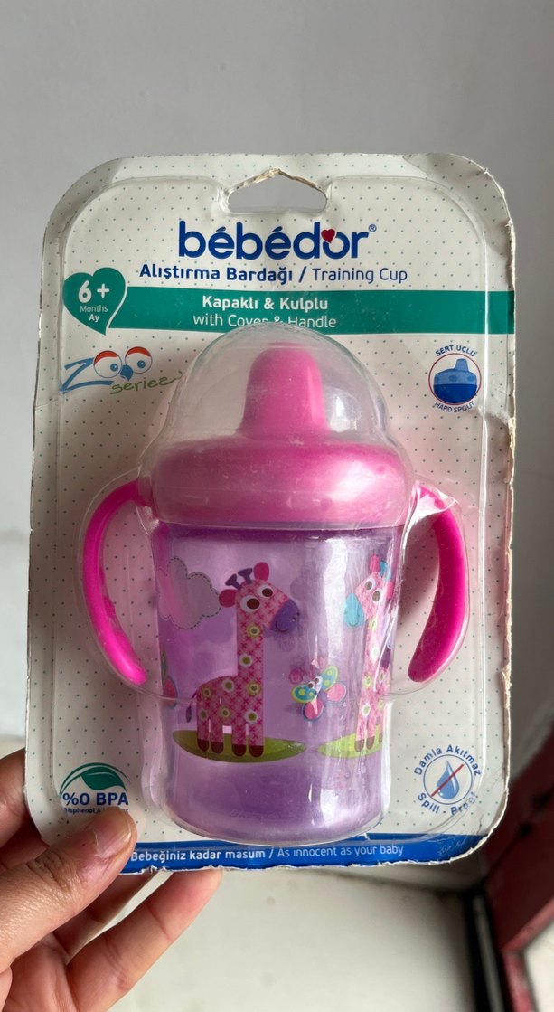Bebédor alıştırma bardağı, kulplu ve kapaklı, 6 ay ve üzeri bebekler için renkli tasarıma sahiptir. BPA içermez ve dökülmeyi önler.