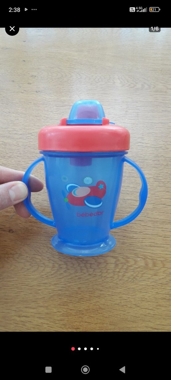 Renkli mavi, kulplu ve kırmızı kapaklı Bebedor marka bebek bardağı. Kolay tutuş ve dökülmeyi önleyici tasarım.