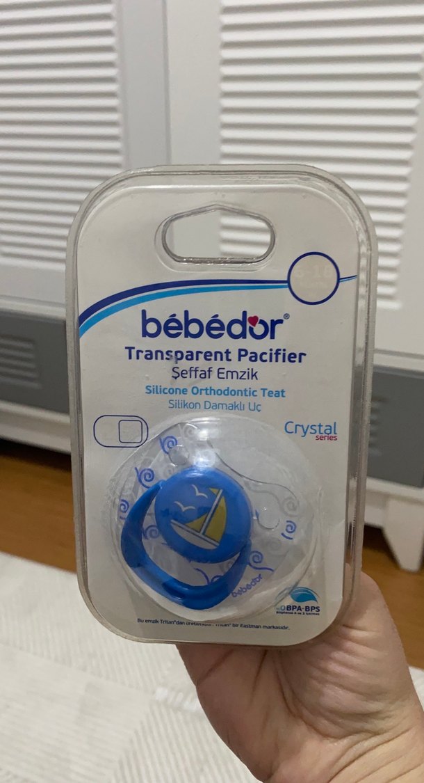 Bebédor şeffaf emzik, silikon damaklı uçlu ve pastel mavi renkte. Güvenli ve rahat kullanım için BPA ve BPS içermez.