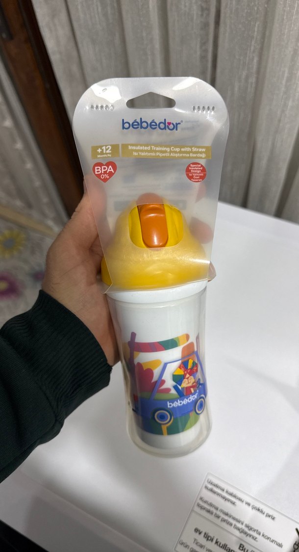 Bebédor markasının sarı renkli, renkli desenli, pipetli ve yalıtımlı eğitim biberonu. BPA içermez, 12 ay ve üzeri bebekler için uygundur.