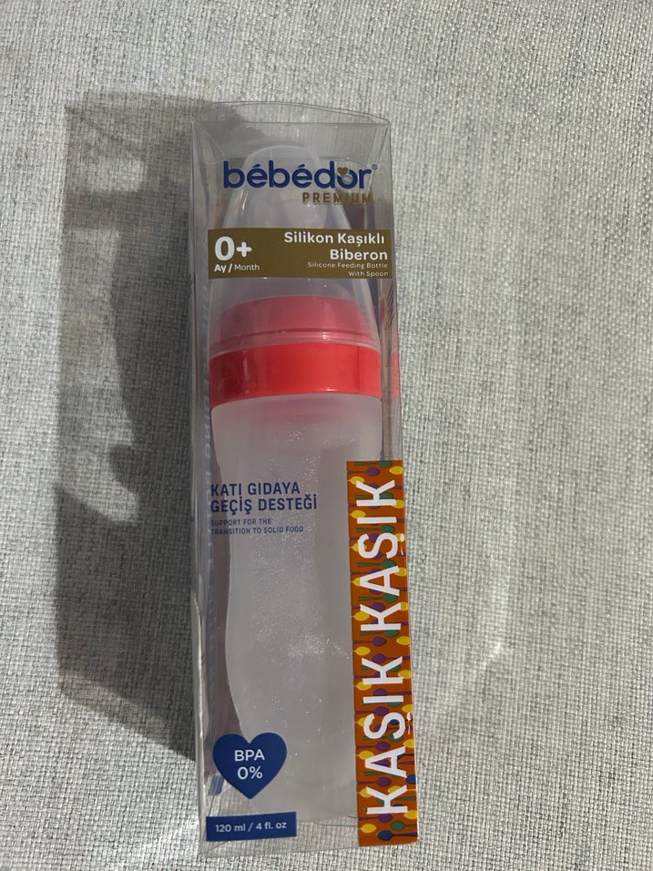 Bebédor kırmızı silikon kaşıklı biberon, katı gıdaya geçiş desteği sunar. BPA içermez ve 120 ml hacmindedir.