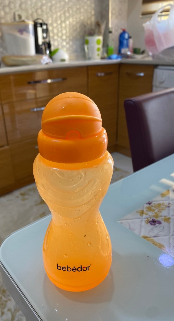 Bébedur markalı, turuncu renkli, ergonomik tasarımlı bebek biberonu. Kolay tutulur ve kapaklıdır. İçinde pipeti yoktur