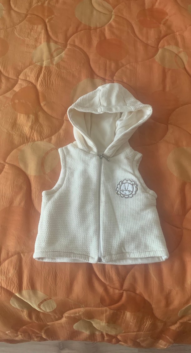 Yeni doğan 0-3 aylık bebek için aslan kapüşonlu, fermuarlı ve yüzde yüz pamuklu astarlı yumuşacık krem rengi yelek. Terletmeyen yumuşak hafif Düz ve pastel tonlarda, sokak stiline uygun rahat bir modeldir. Bebegg markasını bilen bilir fermuarı sağlam aslan armalı temiz ürün