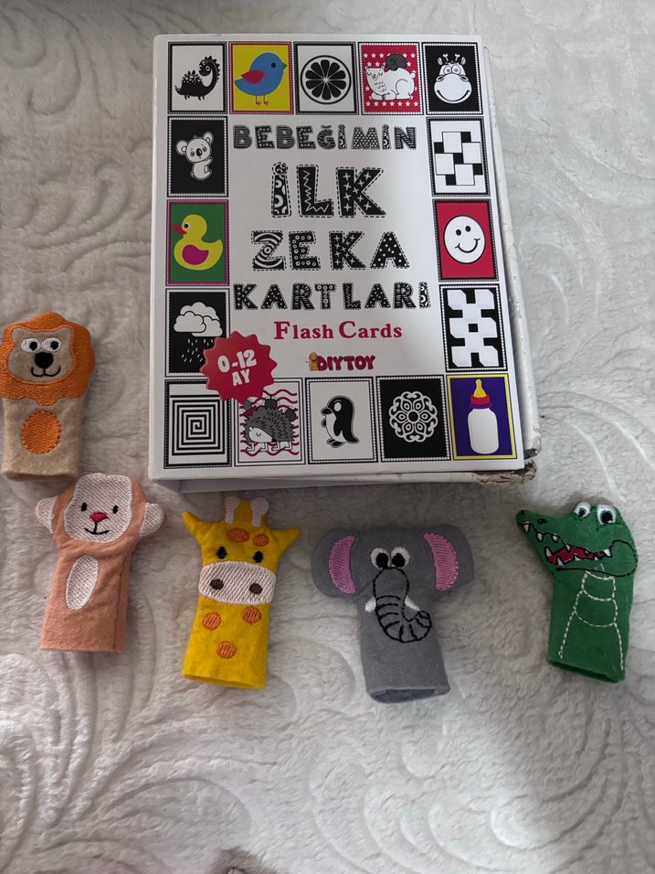 0-12 ay bebekler için çok renkli, hayvan ve şekil çizimleri içeren ilk zeka kartları seti.Ve parmak kukla seti