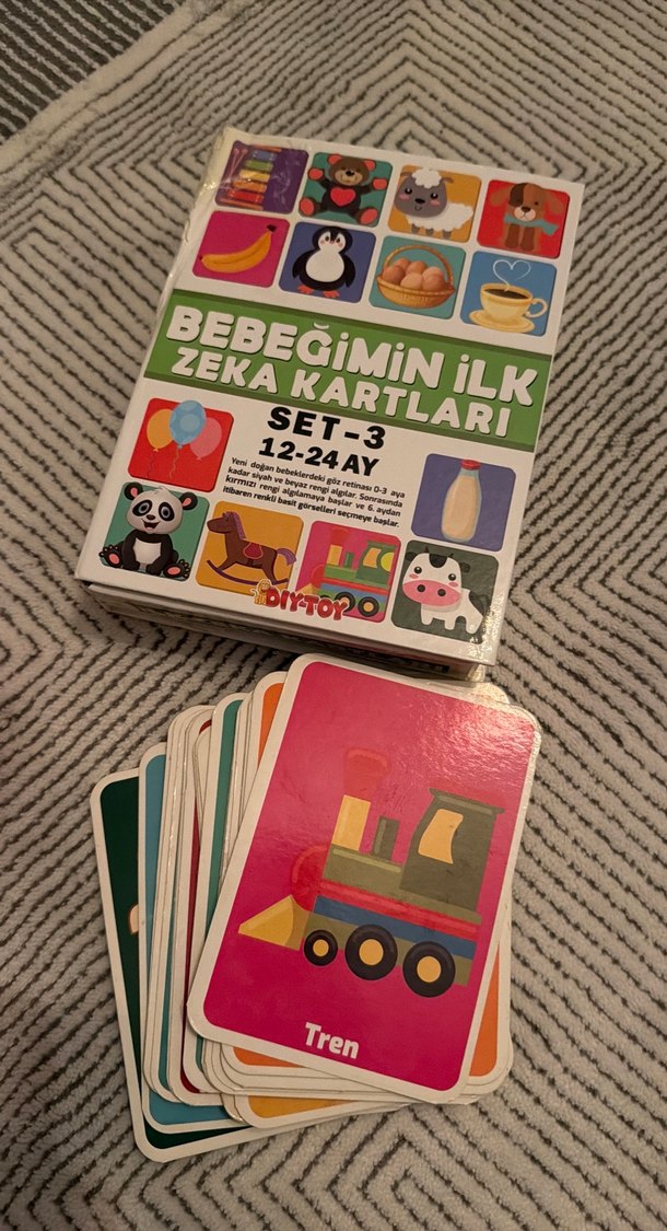 12-24 ay bebekler için renkli ve çeşitli zeka kartları. Hayvanlar, nesneler ve günlük eşyalar içerir.