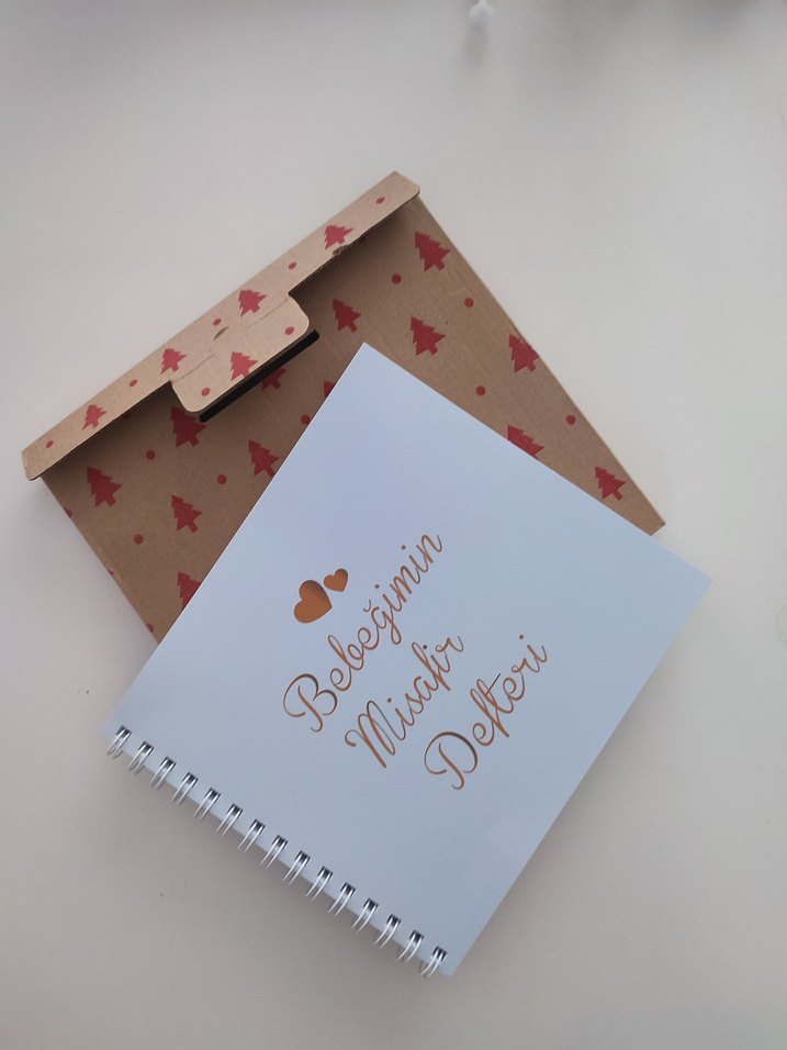 Bebeğinizin Misafir Defteri, spiral ciltli ve kalp desenli beyaz kapaklı. Kırmızı desenli zarflı kutu ile birlikte gelir.