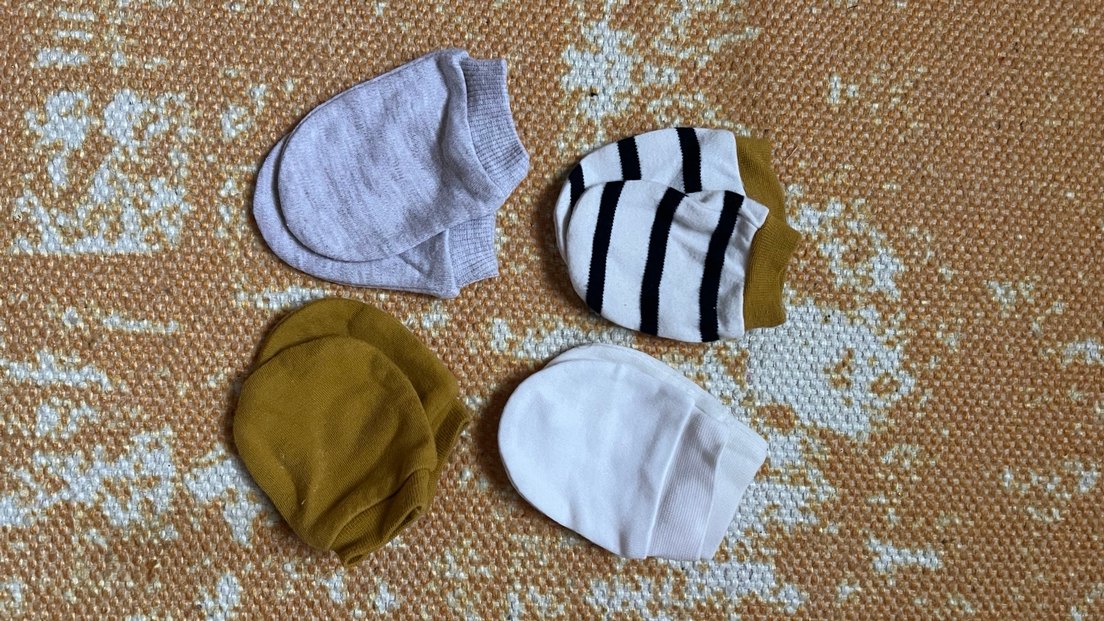 Gri, beyaz, çizgili ve hardal renklerinde erkek çocuk eldiven seti. Yumuşak dokulu, sade tasarımlı eldivenler hemen hemen hiç kullanılmadılar.