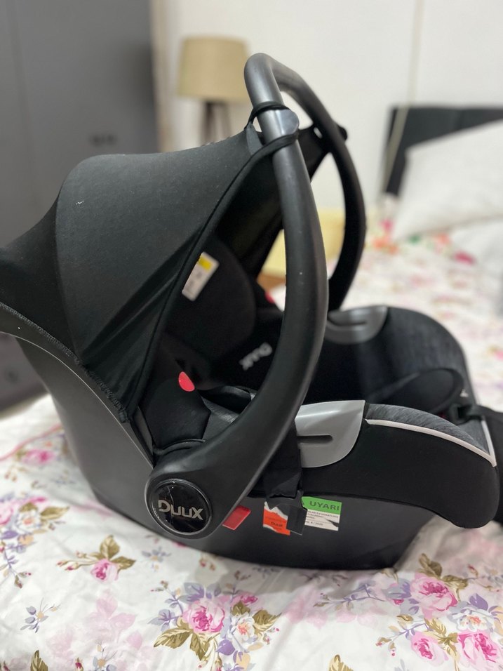 Siyah DULUX bebek oto koltuğu, sağlam tutma sapı ve koruyucu tente ile bebekler için güvenli ve konforlu seyahat sağlar. Hiçbir kusuru yok tertemiz. Çok hafif taşıması kolay, çok dik değil bebek omurgası için uygun, oğlum 2 yaşında 15kg hala içine yatabiliyor. Genişliği ideal. Arabada kullanırken kemer takma yerleri mevcut