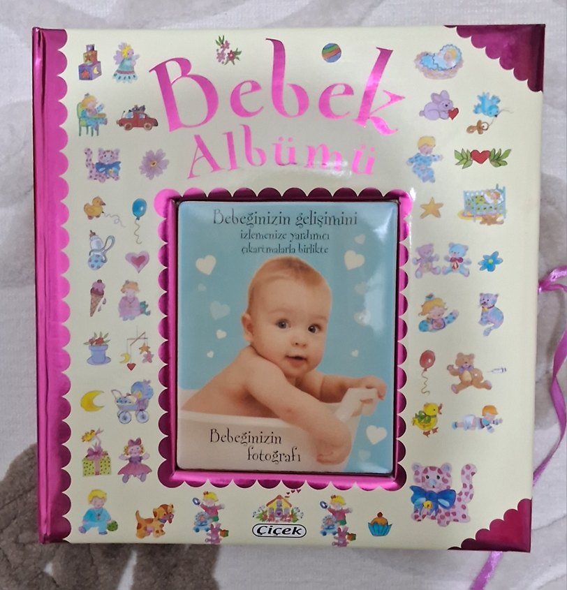 Bebeğinizin gelişimini takip etmenize ve fotoğraflarını saklamanıza yardımcı olan renkli çizimlerle süslenmiş bebek albümü.